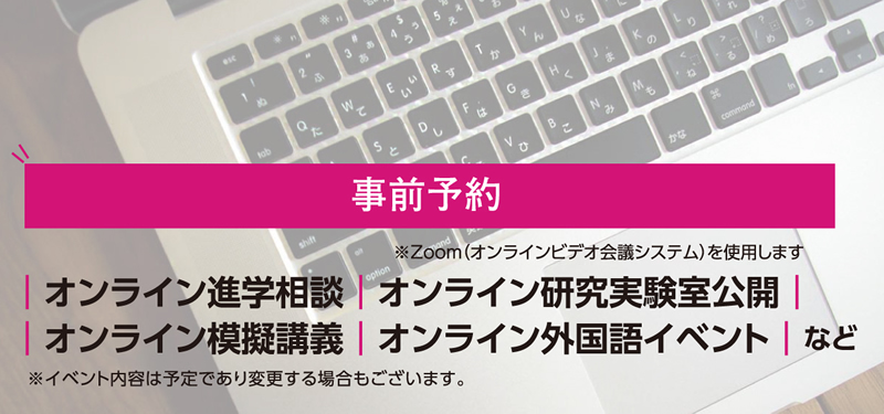 進学相談・研究実験室公開・模擬講義・外国語イベントに参加希望の方は事前のご予約をお願いします。