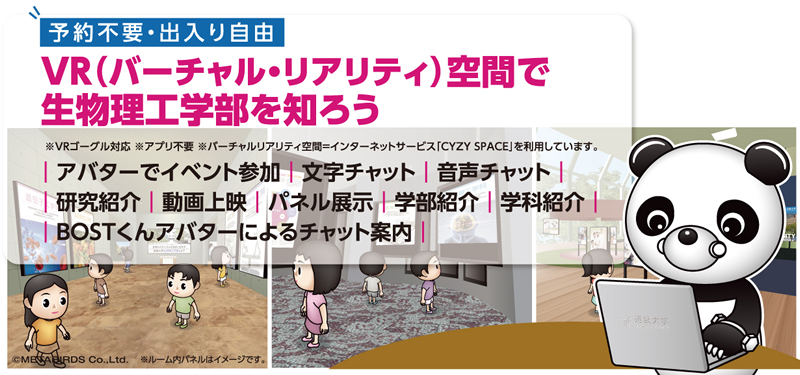 VR(バーチャルリアリティ空間)で生物理工学部を知ろう。開催当日は「BOSTくんアバター」も参加。