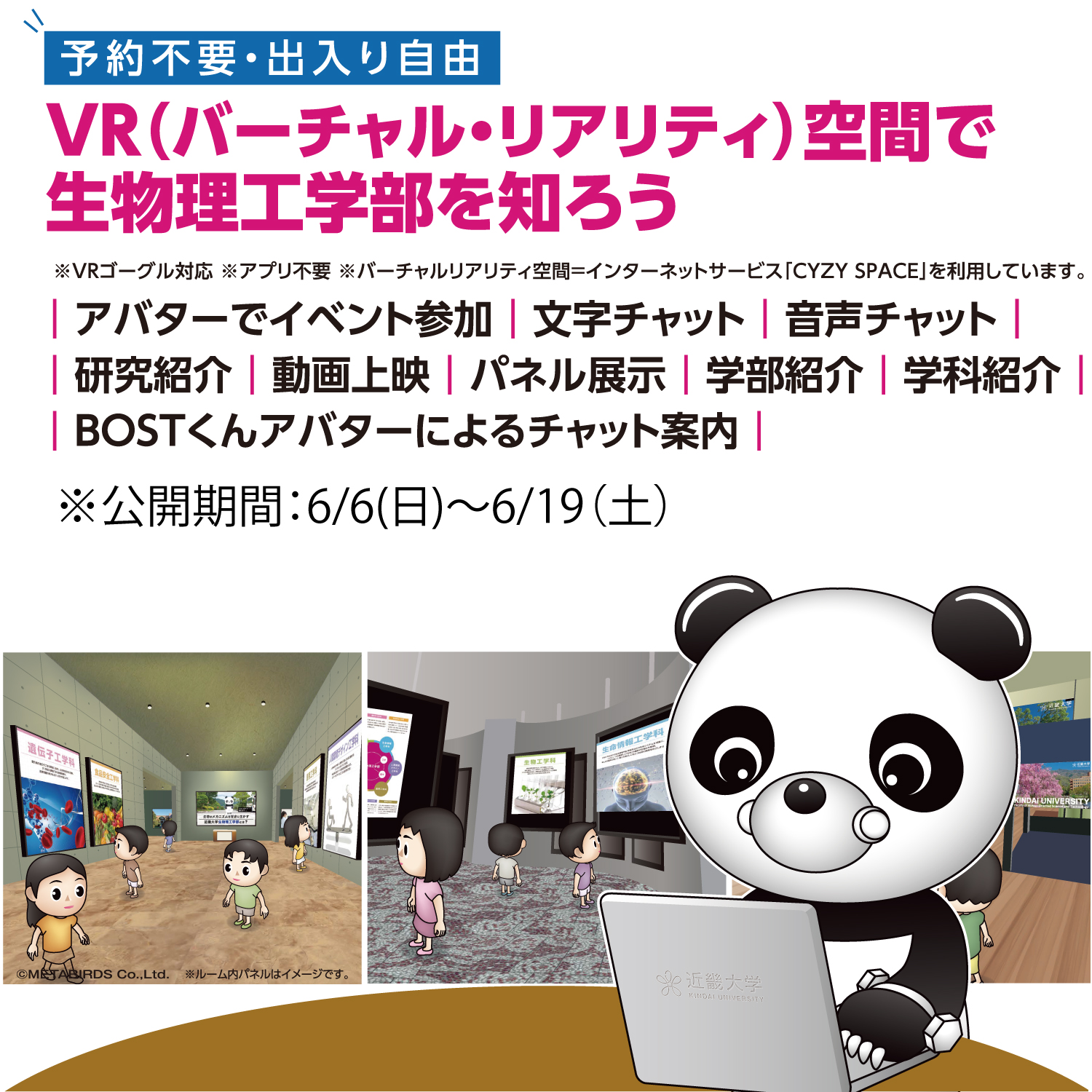 生物理工学部のポータルルームでは「生物理工学部紹介」「入試概要・就職情報等」、特別企画として「マンモス展」と「BOST Language Space」を展示。 各学科パネルからリンクしている各学科のルームに移動すれば、各学科毎の研究紹介や模擬講義、研究室紹介等を観る事ができるんだ! ※当日はBOSTくんアバターも参加するので気軽に声をかけてね(笑) ※公開期間:6/6(日)~6/19(土)