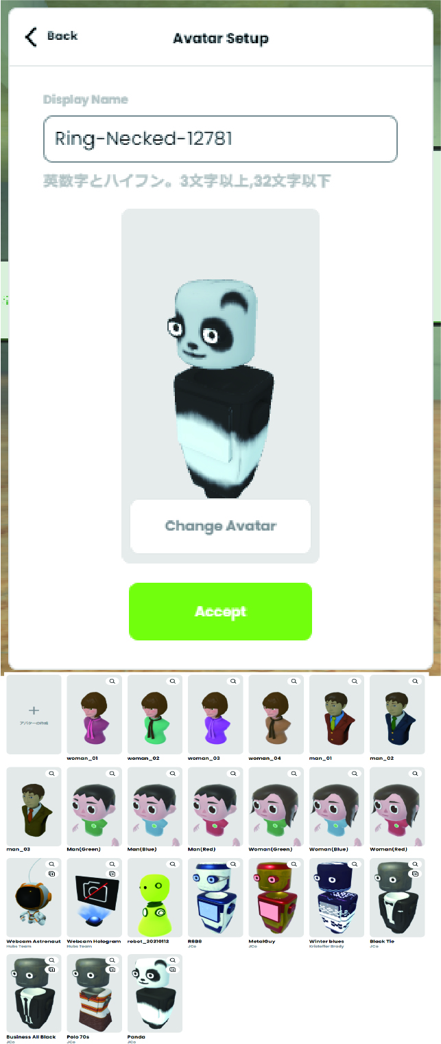 次のページでアバター(分身キャラクター)選択して「Accept」ボタンをクリックします。 |