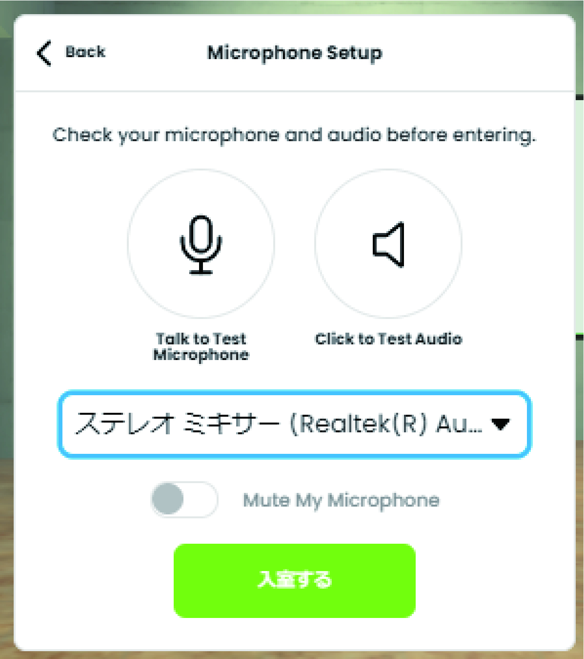 次にマイク、オーディオ設定後、「入室する」をクリックして入室となります。 |